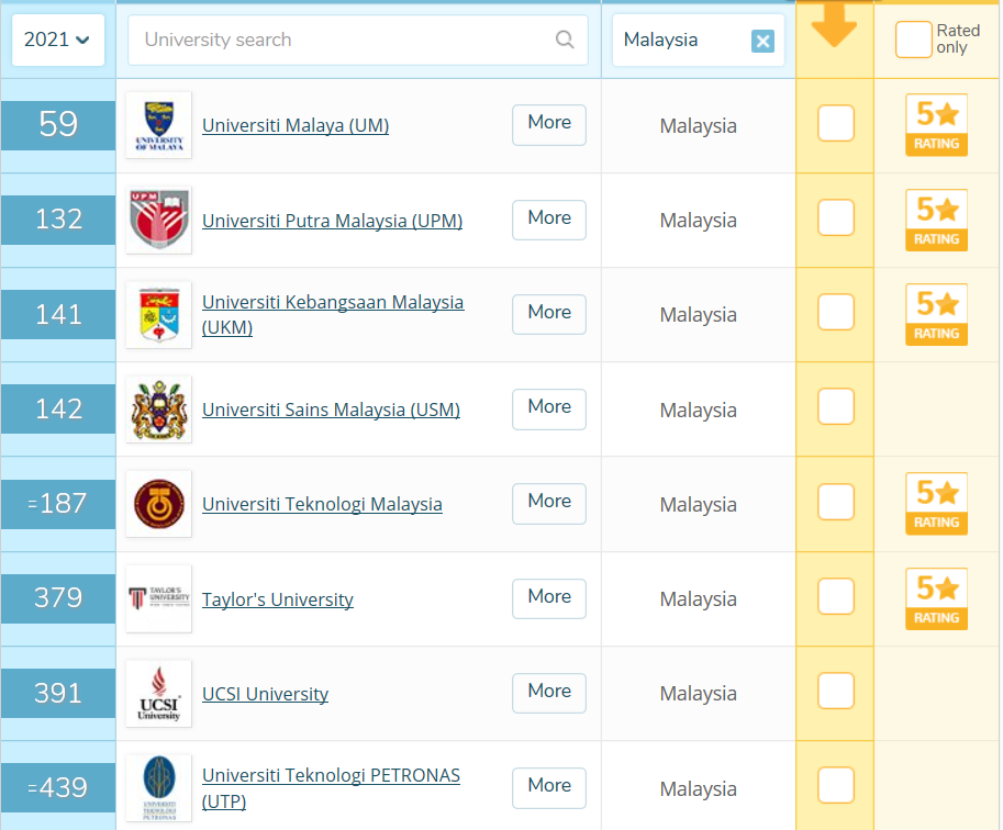 马来亚大学 (UM)1949年建校,位于马来西亚首都吉隆坡市,目前学生人数27000多名,其中本科生14500多人,研究生则有13700多人, 讲师人数2046人.它是一所文科、理科和医学兼有的综合性大学,为马来西亚历史最悠久的学府。