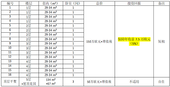 投资200万欧元(不含增值税)可购得项目一整栋公寓楼(共五层),包括16间酒店式公寓(一居室)和一套顶层平墅(三居室),相关参数和投资回报如下: